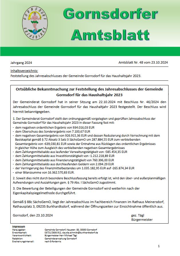 Inhaltsverzeichnis: Bekanntmachung der Auslegung des Entwurfes der 1.Nachtragshaushaltsatzung für das Jahr 2024 mit dem Nachtragshaushaltplan der Gemeinde Gornsdorf.